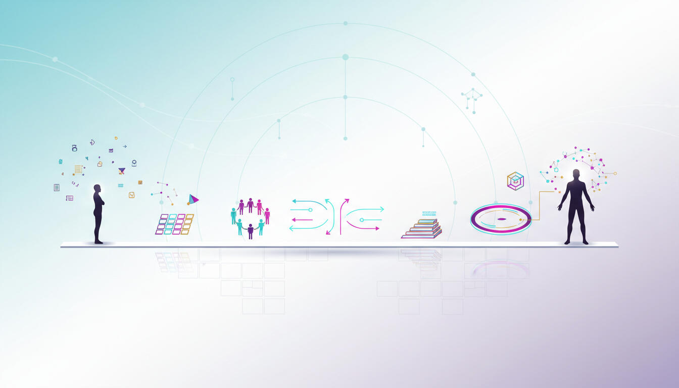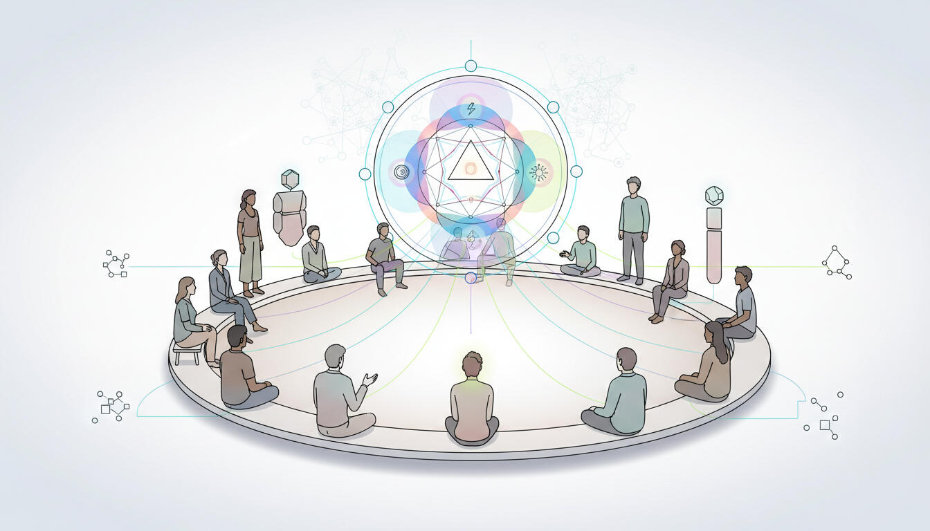The structure is clear; the dialog is alive. There is a defined arc of 8 sessions (e.g., experience, identity, language, systems, AI, stance), but the specific examples, depth, and emphasis are shaped by the real questions and edge cases in the room.